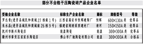 本報訊記者龔漢斌報道:近日,江西省質(zhì)監(jiān)局公布了近期對干壓陶瓷磚產(chǎn)品進(jìn)行省級產(chǎn)品質(zhì)量監(jiān)督抽查的結(jié)果。質(zhì)監(jiān)部門共抽查了51家生產(chǎn)企業(yè)生產(chǎn)的52批次產(chǎn)品,抽樣合格率90.4%。抽查結(jié)果表明,本次抽查的陶瓷磚其放射性核素限量指標(biāo)均達(dá)到了標(biāo)準(zhǔn)規(guī)定的要求;但仍有部分產(chǎn)品存在一些問題。