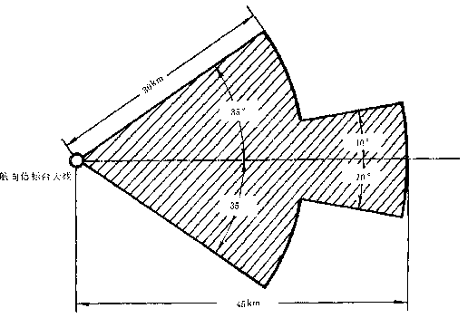 4.1.3  航向信標(biāo)臺向飛機(jī)著陸方向發(fā)射水中極化的扇形合成場型,其覆蓋區(qū)為,以航向信標(biāo)臺大線為基準(zhǔn),在跑道中心延長線±10o以內(nèi)為45km,在10o~35o之間為30km(圖 1)。