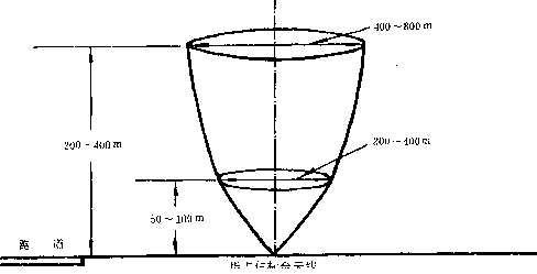 4.3.3 指點信標(biāo)臺向空中發(fā)射垂直扇型波束。其覆蓋區(qū)為,高度50—100m時,縱向?qū)挾葹?00—400m;高度200—400m時,縱向?qū)挾葹?00—800m(圖 5)。