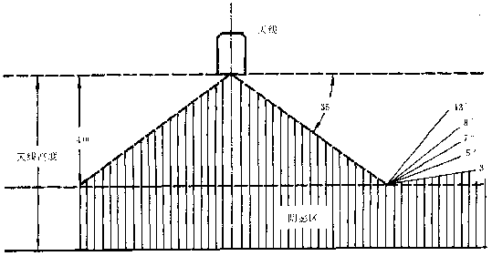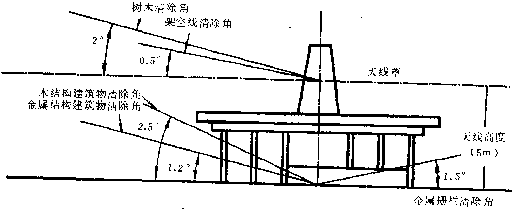 5.7.2  以天線為中心,半徑150m以內(nèi)不得有樹木,距大線150~300m之間不得有高于9m的獨立樹木,300m以外樹木的高度不應(yīng)超過以天線項部為準(zhǔn) 2o垂直張角。