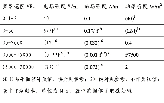 4、對于脈沖電磁波,除滿足上述要求外,其瞬時(shí)峰值不得超過表中1、2所列限值的1000倍。
